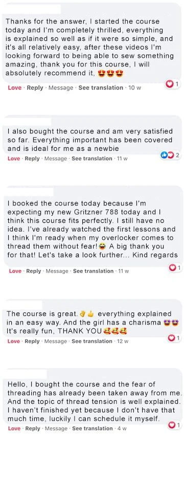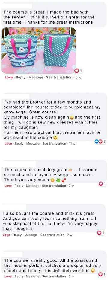 Nicole is an enthusiastic sewist and your tutor in the course. She loves sewing with the serger machine and is excited about the many possibilities the serger offers. Nicole is particularly keen for you to learn to sew on your serger with lots of joy and to discover your machine’s full potential.